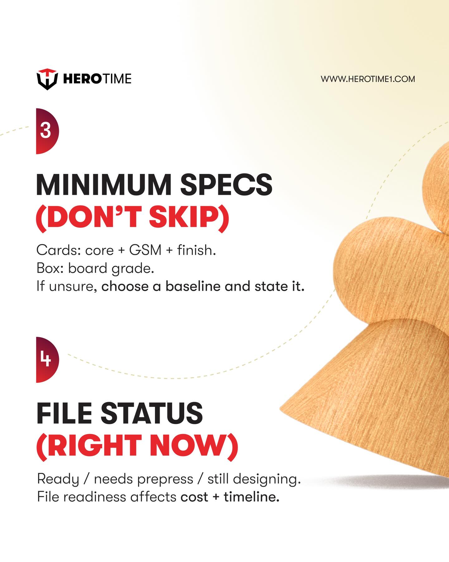 This matters because print-ready files can move directly into production, while incomplete files require prepress work. If your game is still in the design stage, you’ll likely need a more flexible timeline so you can get everything ready, potentially with our help, before starting production.