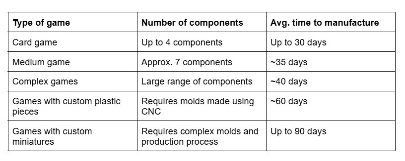 When creators ask this, the honest answer is: it depends on the complexity of your components and the type of production your game requires. The more complicated your needs, and the less your game uses standard components, the longer it will usually take to manufacture.