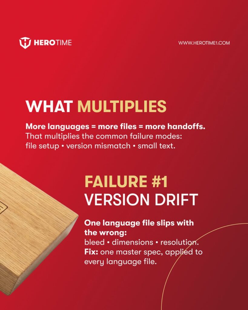 It also helps to use a single version control sheet. A simple spreadsheet can track component, language, version number, translation revision, designer confirmation and the final export confirmation. If it’s not on the sheet, it doesn’t print.