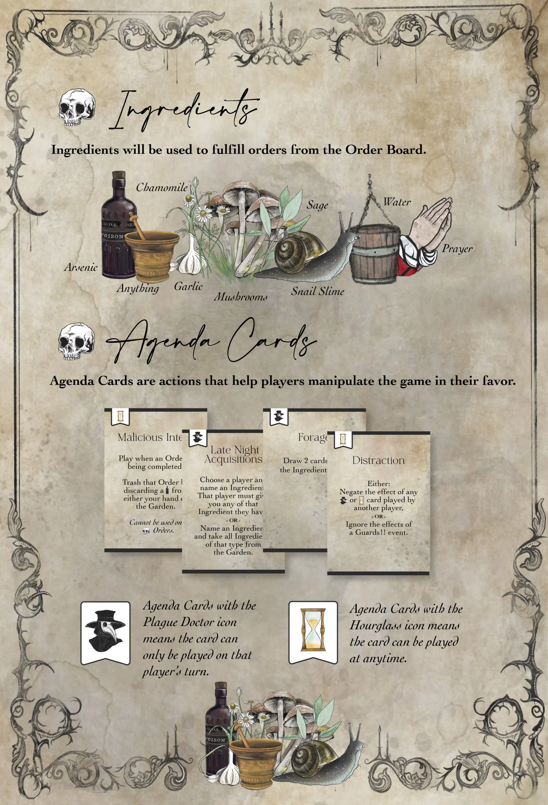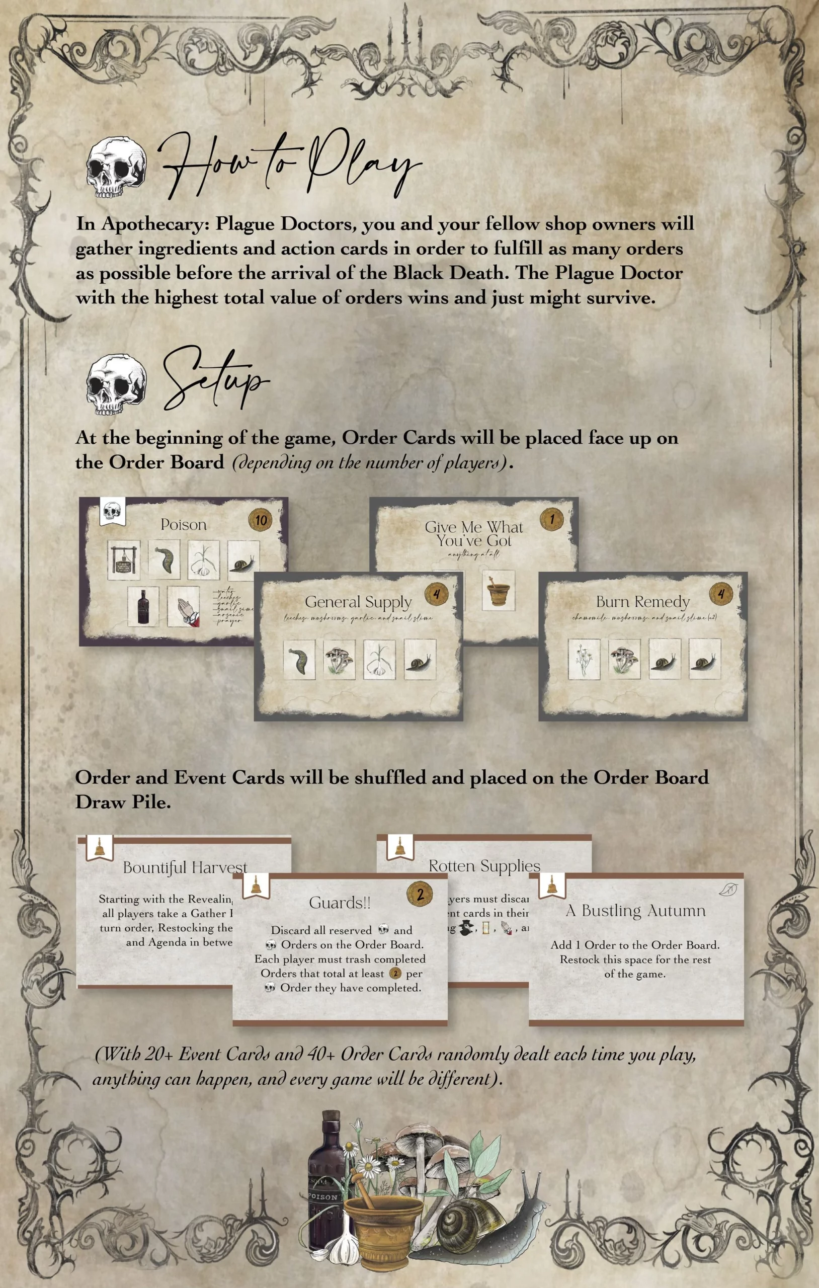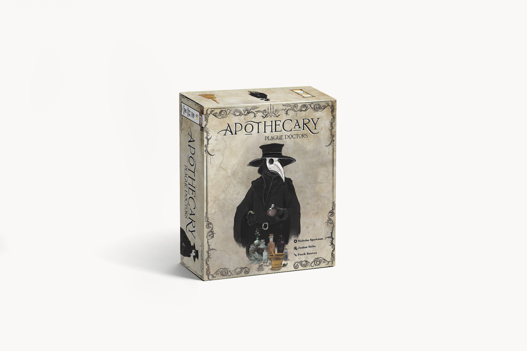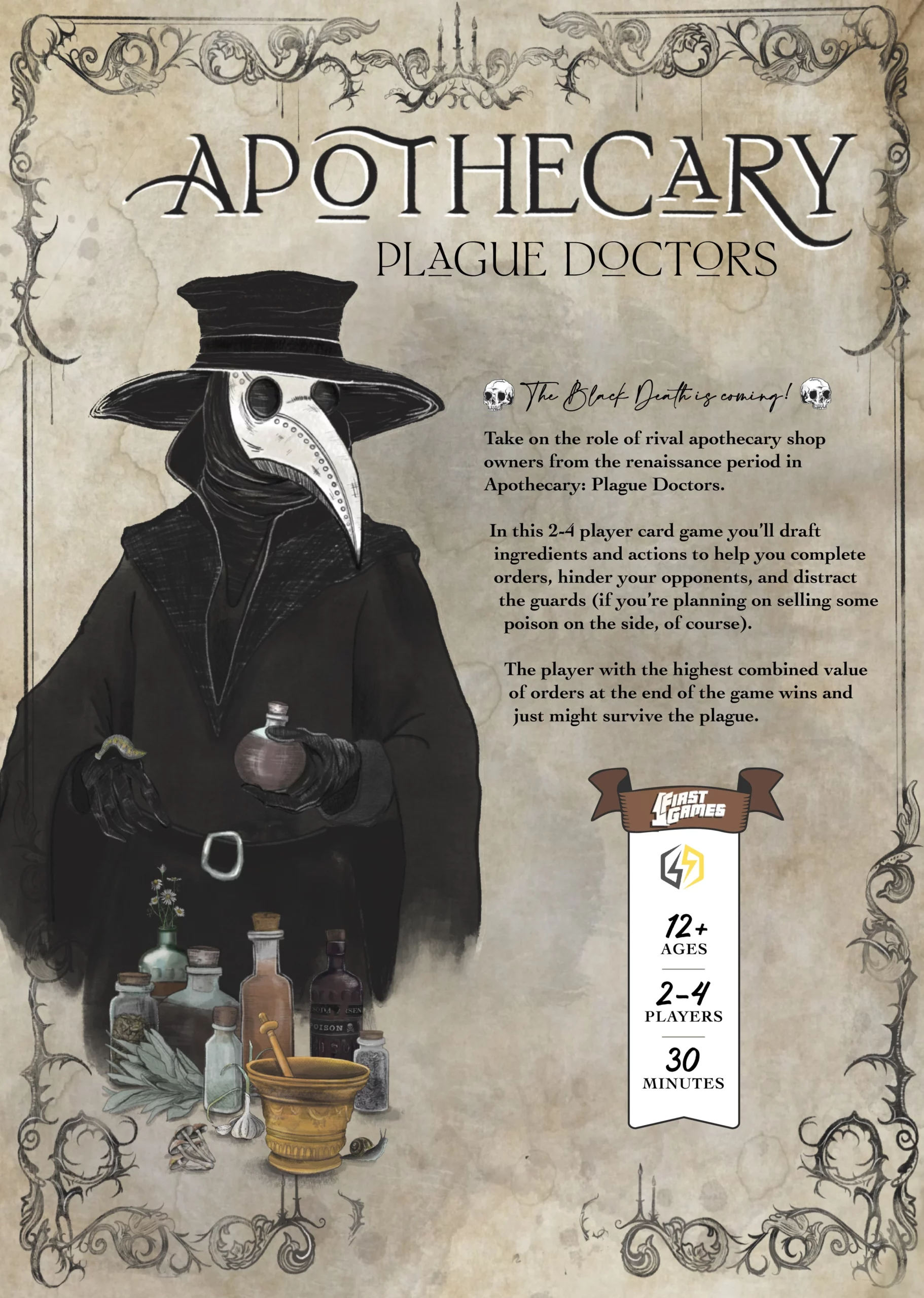 Players compete as apothecary shop owners in Renaissance times, drafting ingredients and action cards to complete orders, block opponents, and distract the guards. The highest total order value wins.