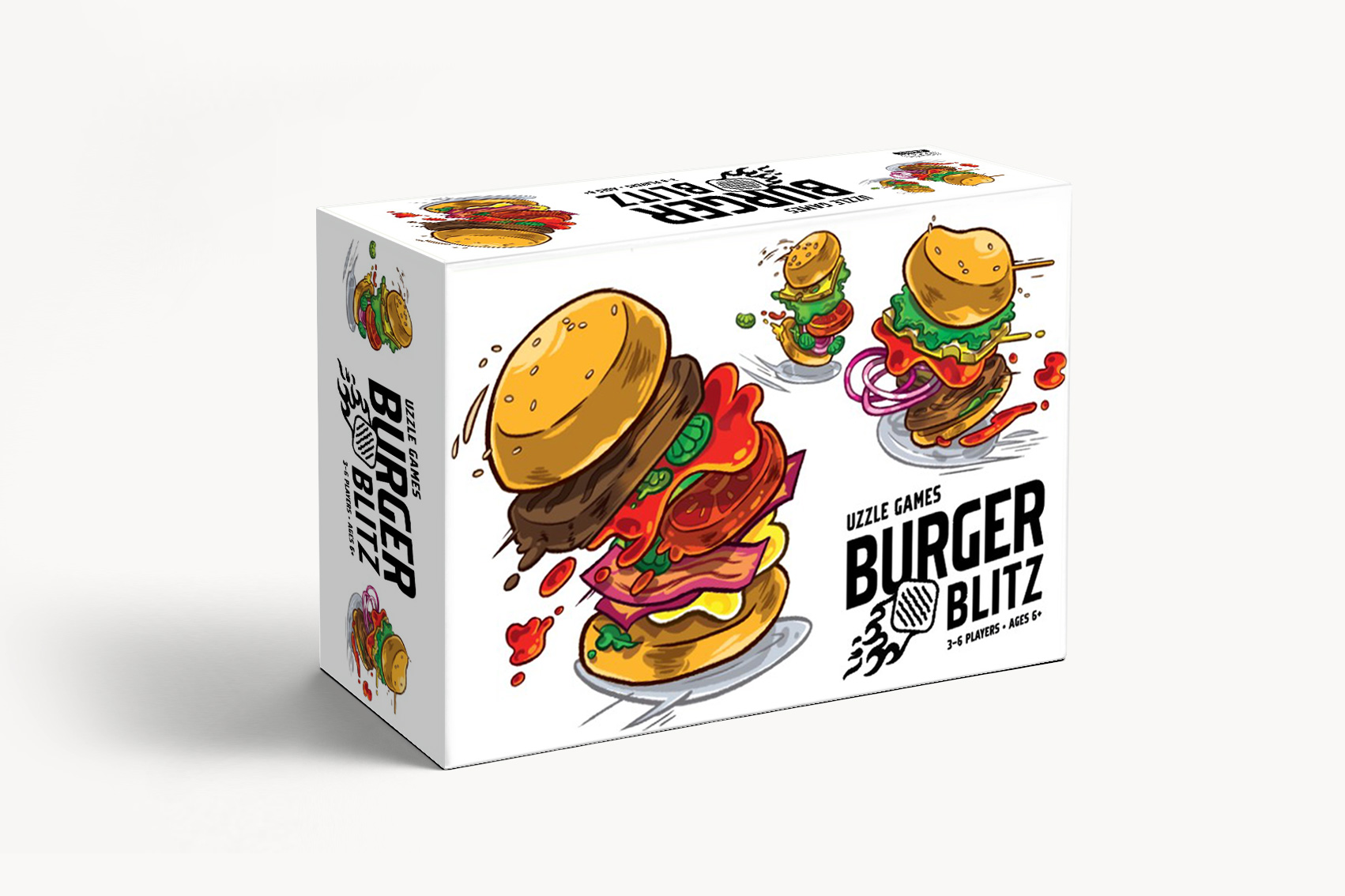 Players are chefs competing to become head chef at Burger Blitz. Roll dice for reputation, tips, attacks, burger ingredients, pepper, and mayo. Spend tips to buy minion cards for permanent bonuses, complete burgers to earn magic cards, and fight for control of “the plate” token to gain advantages.