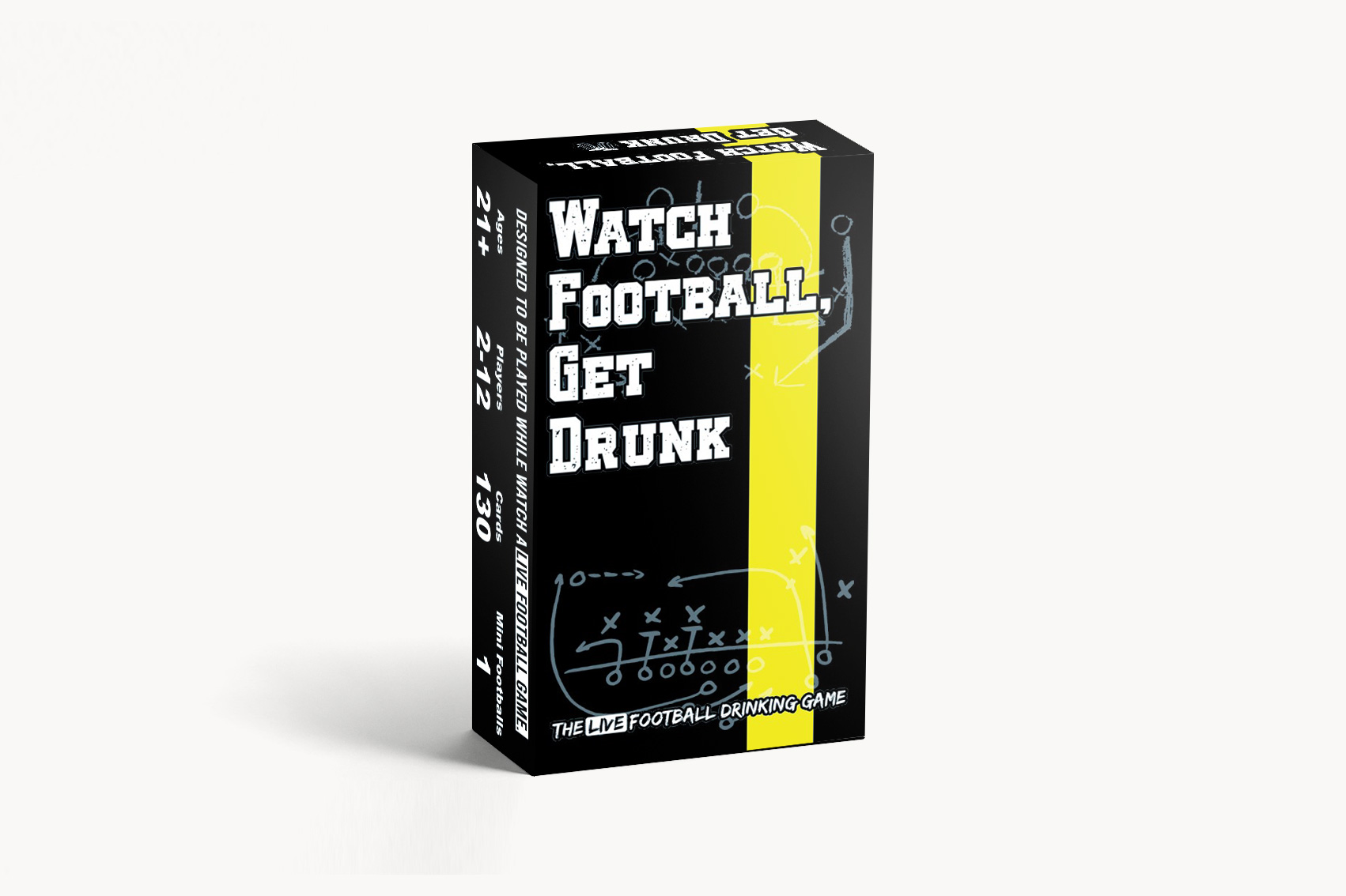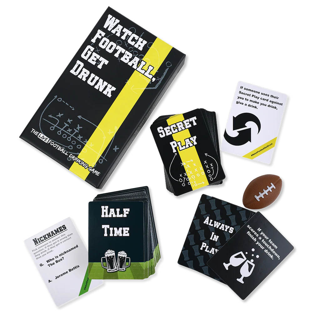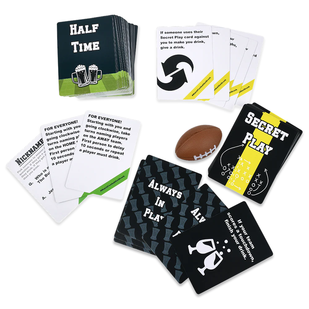 Players receive “Secret Play” cards predicting events during a live football match; when those events happen, they get to make others drink. The game adds trivia, challenges, and group votes to keep breaks fun.